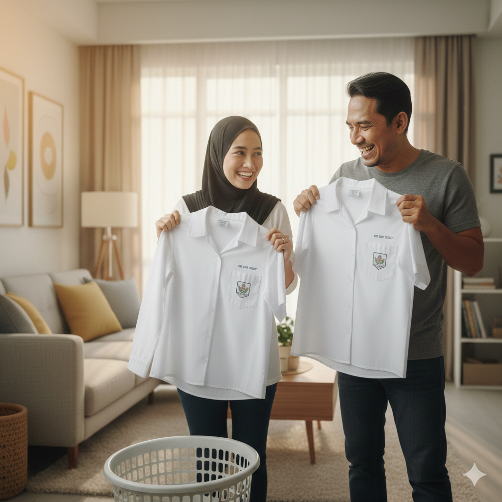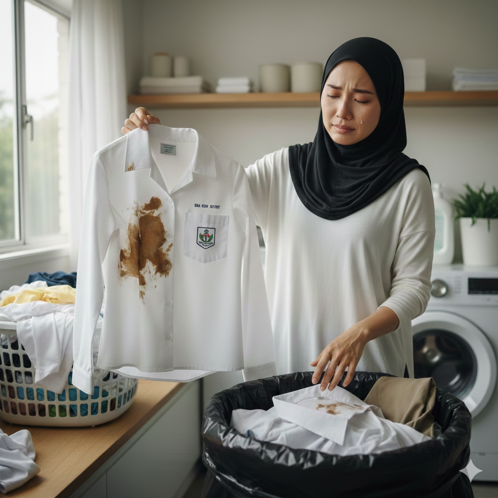Terpaksa buang baju sekolah yang masih baru disebabkan satu kesan kotoran yang tak boleh hilang.